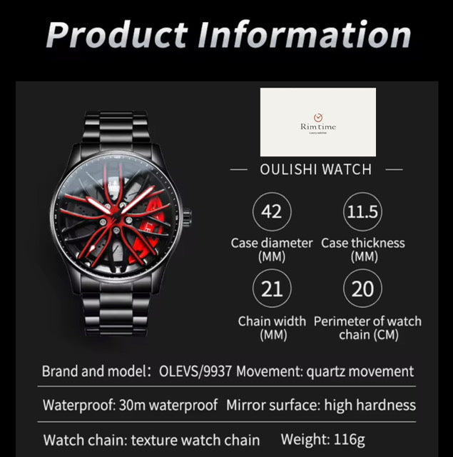 RimeTime Blackout—stealth wheel-rim watch with quartz accuracy, and splash resistance.